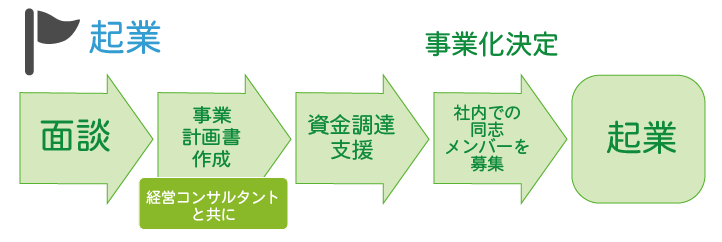 独立を目指す方については、面談後に経営コンサルタントとともに事業計画を作成していただき事業化が決定したならば資金調達、人材募集など起業に向けてサポートさせていただきます。